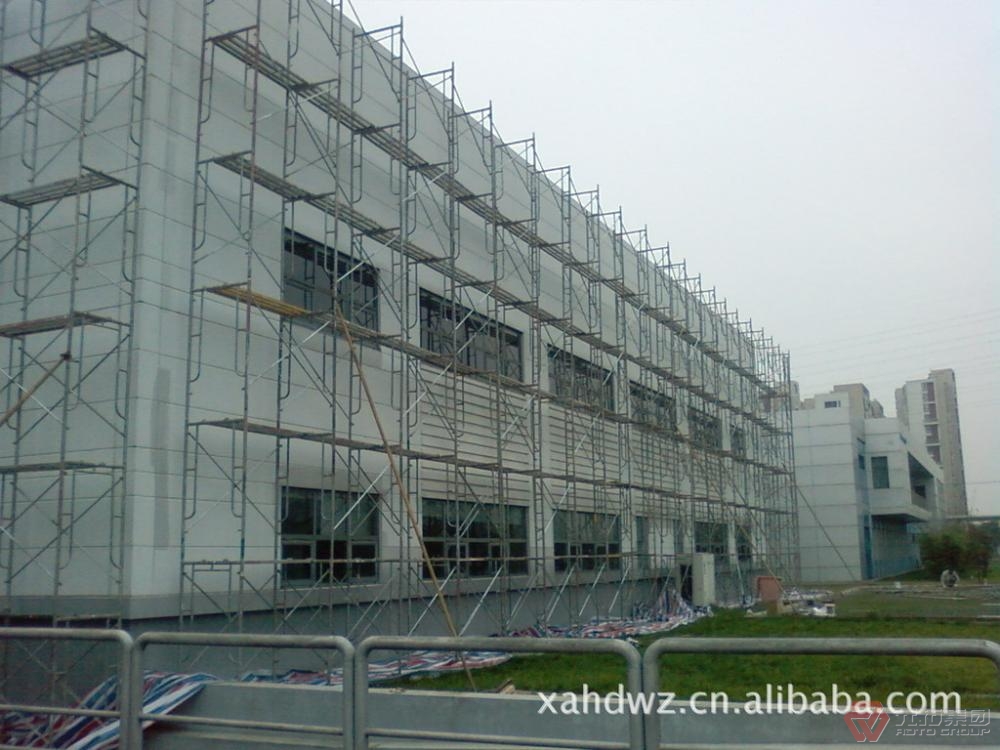 (1)多功能:門式腳手架可組成不同組架尺寸、形狀和承載能力的單、雙排腳手架,能根據(jù)具體施工要求,作為支撐架,支撐柱,物料提升架,爬升腳手架,懸挑架等多種功能的施工裝備。也可用于搭設施工棚、料棚、燈塔等構筑物。特別適合于搭設曲面腳手架和重載支撐架。